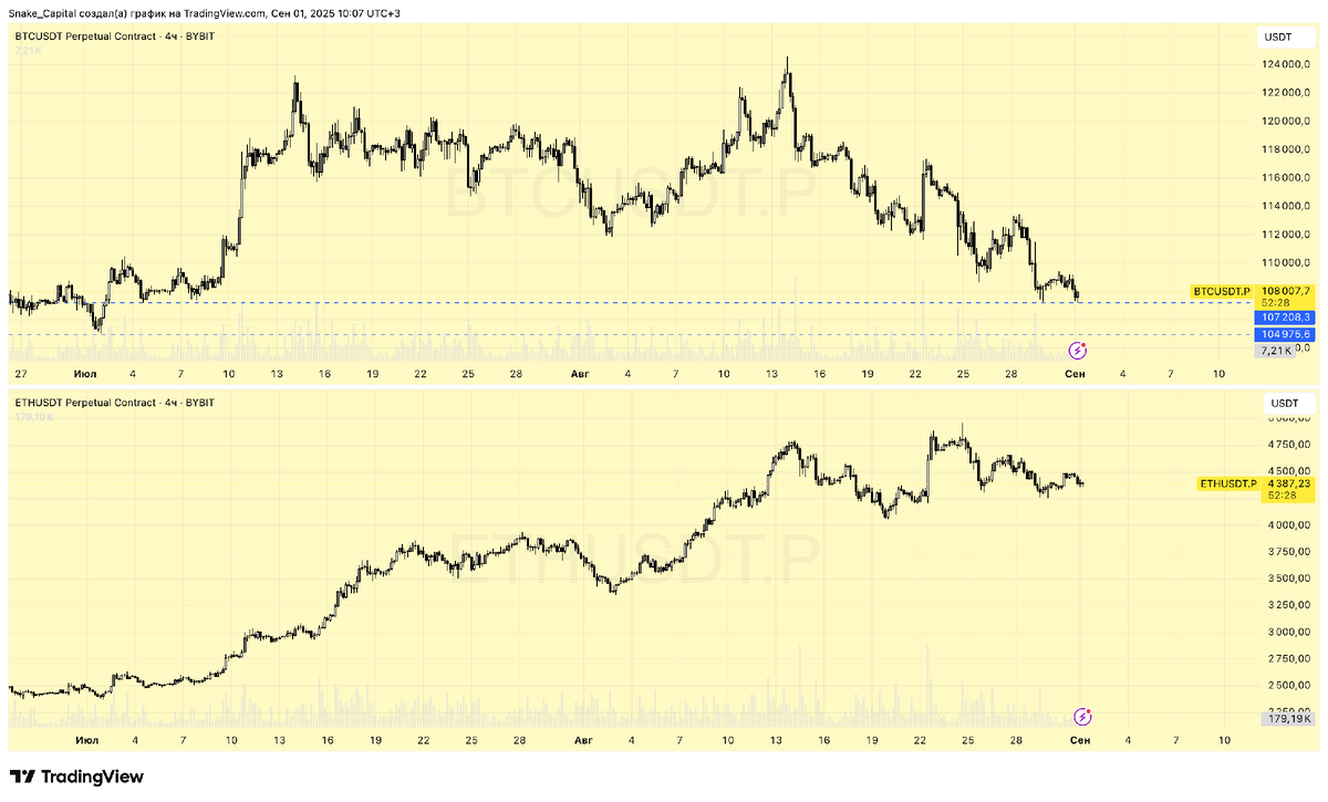 Сопротивление: $110–112 к — укрепление выше может вернуть быков. - Перспективы: если институционалы продолжат закупки, возможно восстановление. Но общий сентябрь остаётся под давлением “Red September” — традиционно слабого месяца.