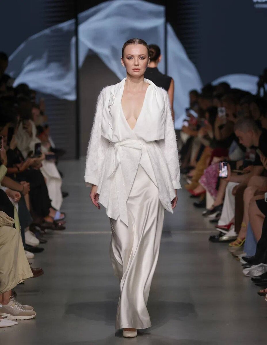 Коллекция бренда LOST GENOME (Санкт-Петербург) на подиуме Московской недели моды Бренд представил осенне-зимнюю коллекцию «Тонкости Востока», в которой восточные мотивы переосмыслены сквозь призму высокой моды. В основе линейки — платье-кимоно, жакеты прямого кроя, струящиеся брюки и платья, объемные стеганые пальто. Особое внимание уделяется деталям: изделия дополнены элементами в виде цветов каллы, брошами, вышивкой ручной работы, а также японским рисунком.