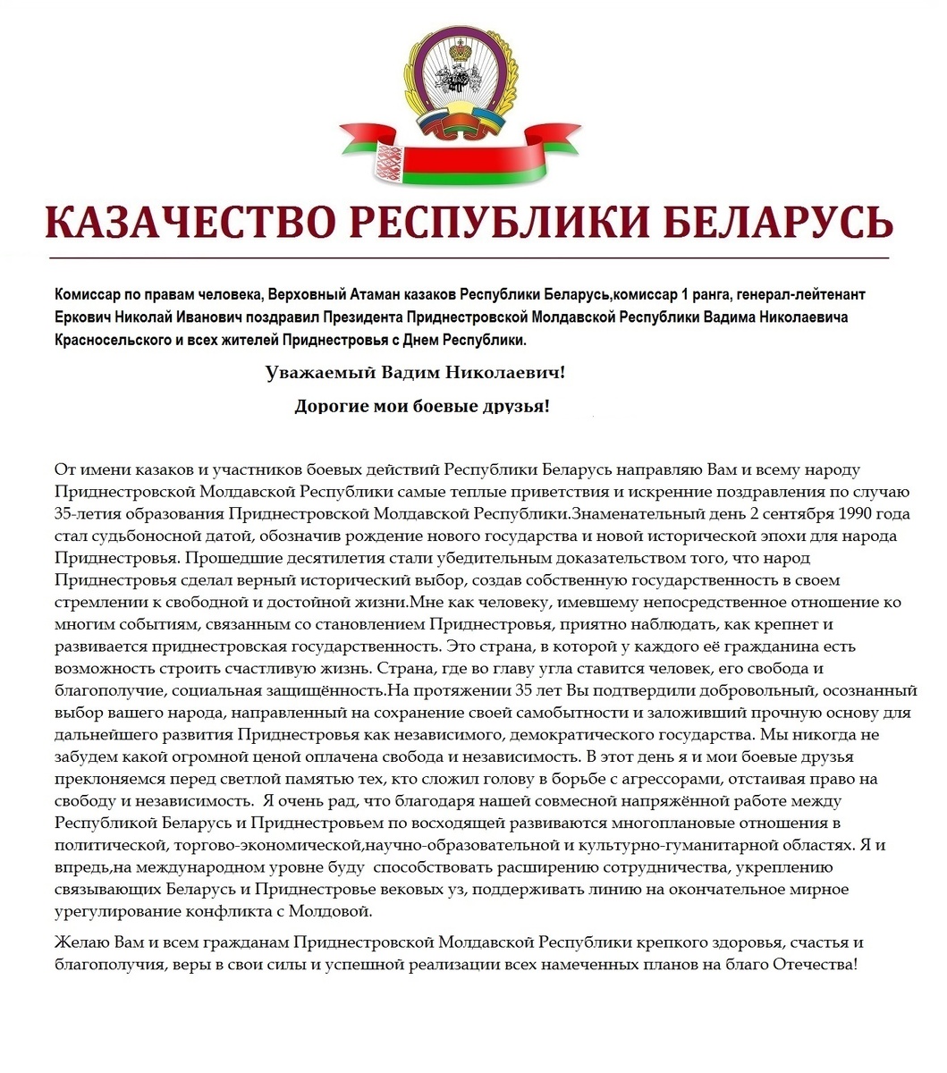 Дорогие мои боевые друзья! От имени казаков и участников боевых действий Республики Беларусь направляю Вам и всему народу Приднестровской Молдавской Республики самые теплые приветствия и искренние поздравления по случаю 35-летия образования Приднестровской Молдавской Республики.Знаменательный день 2 сентября 1990 года стал судьбоносной датой, обозначив рождение нового государства и новой исторической эпохи для народа Приднестровья. Прошедшие десятилетия стали убедительным доказательством того, что народ Приднестровья сделал верный исторический выбор, создав собственную государственность в своем стремлении к свободной и достойной жизни. Мне как человеку, имевшему непосредственное отношен