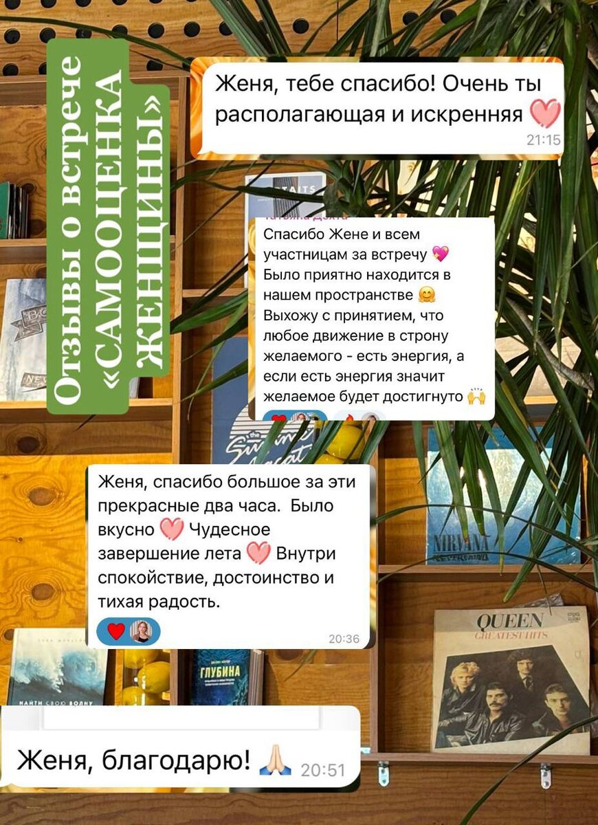 Иногда наша самооценка нуждается в нежной поддержке, чтобы расцвести и стать крепким внутренним стержнем. Подводим итоги встречи «САМООЦЕНКА ЖЕНЩИНЫ» 🙌прекрасные #отзывы ⬆️ Я выкладываю для вас несколько способов, которые помогут вам бережно укреплять самооценку и веру в себя: 🌸 Выбирайте лучшее для себя. Каждый раз, когда есть выбор, отдавайте предпочтение тому, что действительно поддерживает вас и делает счастливее. 🌸 Живите из состояния “мне себя уже достаточно”. Попробуйте почувствовать, что прямо сейчас вы ценные, достойные и важные — без условий и ожиданий. 🌸 Дарите себе радость. Пусть хотя бы раз в неделю будет маленький праздник для души — книга, прогулка, вкусный десерт или время в тишине. 🌸 Хвалите себя каждый вечер. Перед сном скажите: «Какая я молодец, что…» и найдите 3–5 поводов поблагодарить себя. 🌸 Отвечайте на внутреннюю критику. Если в голове звучит «Опять не получилось…», добавьте: «ЗАТО я…» и найдите светлую сторону. 🌸 Задавайте себе честные вопросы. «