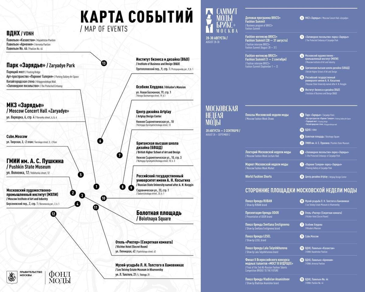 Стартовало сразу два события — Московская неделя моды и BRICS+ Fashion Summit. На эту неделю Зарядье станет точкой притяжения профессионалов индустрии и представителей крупнейших СМИ со всего мира, а Москва укрепит свой статус, как центр принятия стратегических решений. В программе BRICS+ Fashion Summit — пленарные сессии и дискуссии, а ещё выставка «Родные мотивы». Она раскрывает богатство культурного наследия регионов и их преемственность в современном национальном дизайне. в программе будут мини-коллекции дизайнеров со всей России — от Архангельска до Якутии и от Тувы до Кабардино-Балкарии. Специально для выставки были созданы видеоролики, в одном из которых представлена онлайн-экспозиция Российского этнографического музея, посвящённая народному костюму, вписанному в современность. Посетить деловую программу и выставку «Родные мотивы» Саммита можно бесплатно — нужно лишь зарегистрироваться. Так-же параллельно стартовала Московская неделя моды. Она проходит на ключевых площадках ст