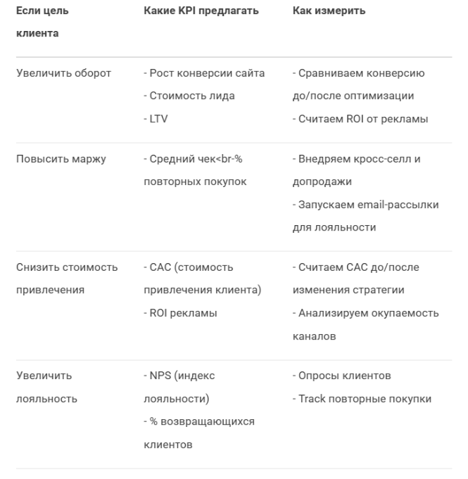 Теперь клиент ждет: «За счет роста трафика мы увеличили количество заявок на 25%, а средний чек — на 15%». Вот примеры, как связать метрики агентства с целями клиента: Главный секрет: Клиент не хочет ни трафика, ни охвата. Он хочет роста бизнеса, а значит и продаж. Ваша зад