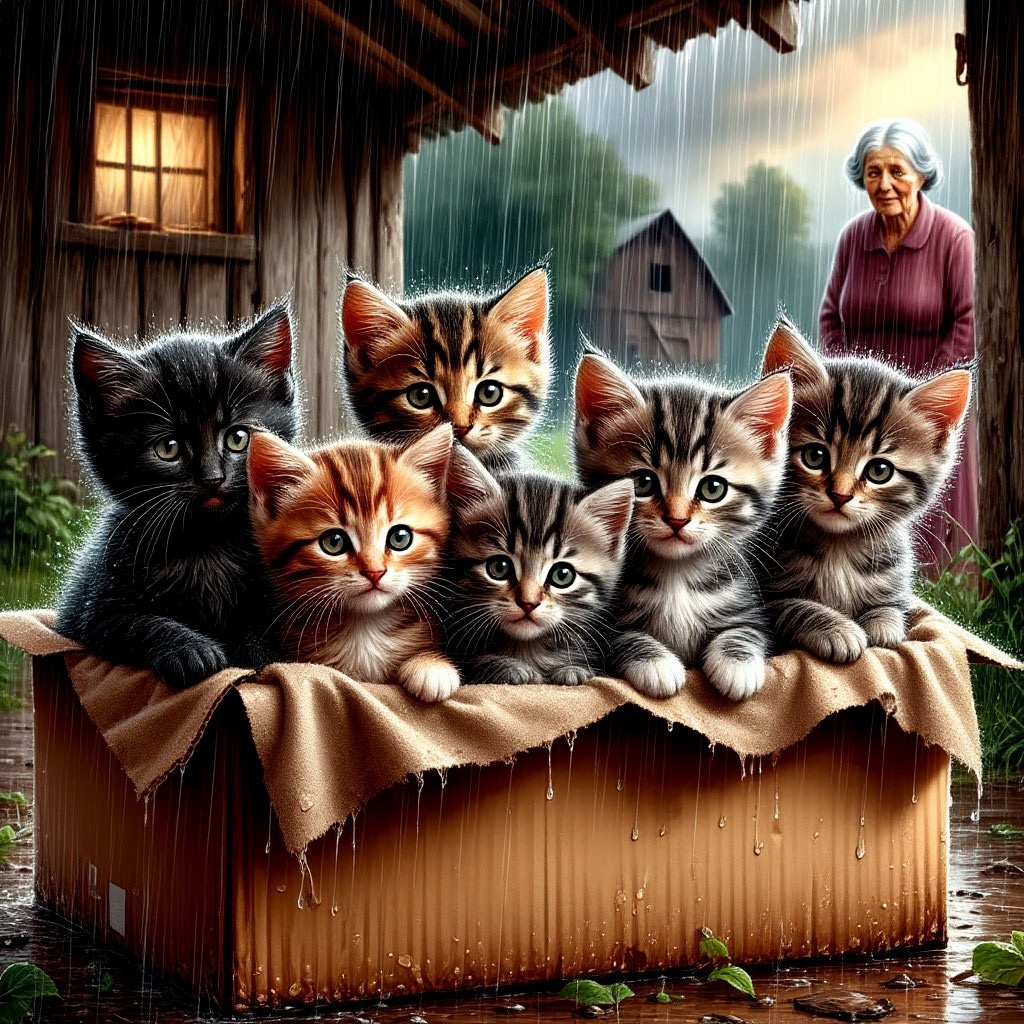 Однажды, когда Мамы не было рядом, начался сильный дождь. Котята, испугавшись раскатов грома, забились под сарай и жалобно мяукали. Баба Нюра, услышав их, вынесла из дома большую коробку, застелила её мягкой тканью, и поставила возле сарая.