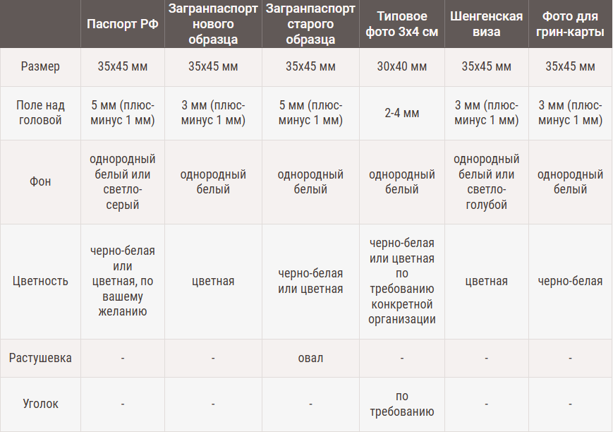 Сделайте несколько кадров, выберите самый удачный и приступите к его обработке. То, как нужно сделать обрезку или кадрирование, зависит от типа документа, для которого вы фотографируетесь. Основные требования для разных фотографий мы собрали в таблицу:
