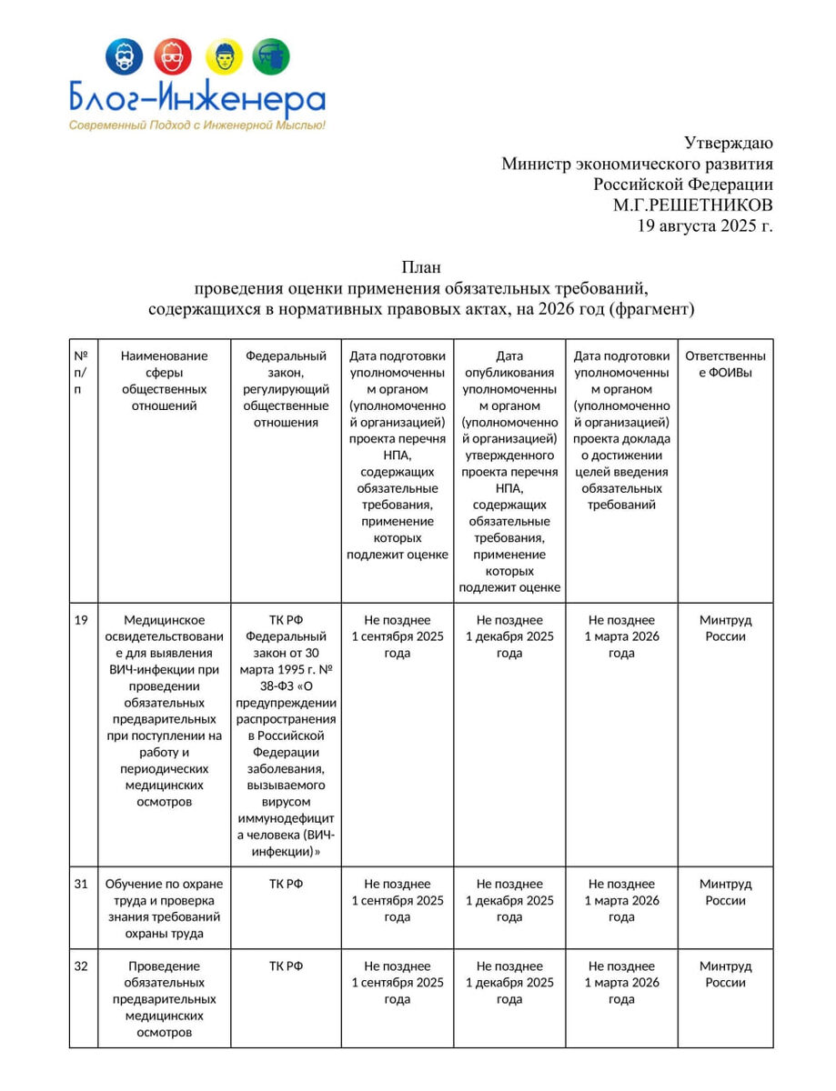 ⚡️ Минтруд вынес на обсуждение Перечень нормативных правовых актов, содержащих обязательные требования, подлежащие оценке применения в 2026 году ℹ️ Соответствующий проект размещён на портале проектов НПА. Открыв его, мы сильно удивились. В списке единственный документ — это совместный приказ Минтруда России и Минздрава России № 988н/1420н от 31.12.2020 «Об утверждении перечня вредных и (или) опасных производственных факторов и работ, при выполнении которых проводятся обязательные предварительные медицинские осмотры при поступлении на работу и периодические медицинские осмотры». В пояснительной записке к проекту указано, что он разработан в соответствии с пунктом 32 Плана проведения оценки применения обязательных требований, содержащихся в нормативных правовых актах, на 2026 год, утв. Минэкономразвития России 19 августа 2025 года. Удивление наше было обусловлено тем, что в Плане Минэка значится три документа, а не один! Мы сделали выборку НПА, подлежащих оценке, из области охраны тр