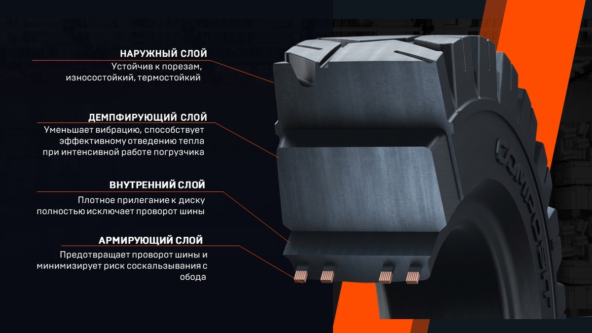 В современных условиях эксплуатации спецтехники надежность и долговечность шин становятся ключевыми факторами эффективности работы. От их качества напрямую зависит не только производительность, но и безопасность, а также экономическая целесообразность использования техники. Цельнолитые шины компании Композит зарекомендовали себя как оптимальное решение для самых сложных условий эксплуатации. Надёжность наших цельнолитых шин (суперэластик) обусловлена особой многослойной конструкцией. Термостойкий и износостойкий наружный слой устойчив к порезам и отлично показывает себя на различных поверхностях, обеспечивая качественное сцепление. Высота протектора способствует увеличению срока службы при езде по рельефной поверхности. Демпфирующий слой необходим для уменьшения вибрации. Благодаря этому снижается нагрузка на детали ходовой части погрузчика, а ещё создаются более комфортные условия для работы водителя. Также демпфирующий слой позволяет эффективно отводить тепло при интенсивной работе.