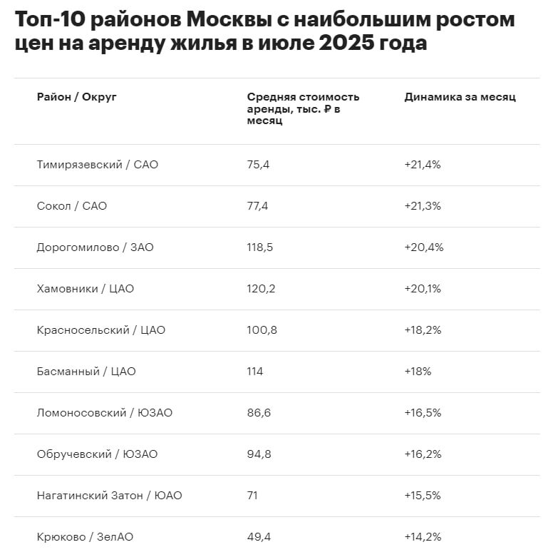 🔥 Аренда в Москве: Горячий июль и цены, которые "кусаются"! Хотели найти квартиру в Москве? Приготовьтесь к неожиданностям, особенно если ваш поиск приходится на июль 2025-го! По данным «РБК Недвижимости», рынок аренды показал себя с самой огненной стороны. Представьте: Тимирязевский район — аренда тут взлетела на целых 21,4%! Средняя "однушка" теперь обходится в 75,4 тыс. рублей. Эксперты говорят, что это не просто рост, а настоящий "ценовой скачок", вызванный исчезновением с рынка самых бюджетных вариантов. Если вы рассчитывали на что-то недорогое, то, похоже, самые выгодные предложения уже разобрали. Идем дальше: Сокол (+21,3%) и Дорогомилово (+20,4%) тоже не отстают, демонстрируя впечатляющий рост. В целом, в десятке районов-лидеров по подорожанию — сплошь знакомые имена: Хамовники, Красносельский, Басманный. Что это значит? Рынок недвижимости в Москве — это живой организм. Сегодня цены растут в одном районе, завтра — в другом. Так что, если вы в поисках, следите за динамикой