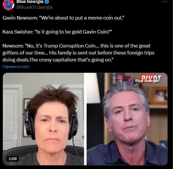 🗣 «Trump Corruption Coin»: коррупция Трампа уходит в блокчейн Губернатор Калифорнии Гэвин Ньюсом заявил о планах выпустить мем-коин под названием Trump Corruption Coin. По его словам, цель — подчеркнуть абсурд криптовалютных проектов Дональда Трампа и привлечь внимание к «грифтерам нашего времени». Ньюсом отметил, что средства от токена пойдут на кампанию за демократию — перераспределение округов и работу с избирателями. «Посмотрим, чей коин окажется успешнее», — сказал он в подкасте Pivot. Трамп, в свою очередь, активно зарабатывает на криптовалютах: по данным СМИ, с 2022 года его доход от мем-коинов, NFT и токенов превысил $2,4 млрд, что составляет около 44% его состояния.