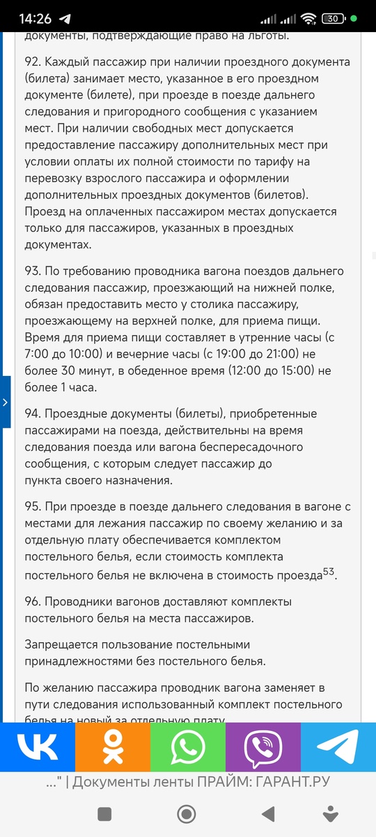 А как же п.92? Спросите вы. А п.93 является исключением, отвечу я вам. К тому же, каждый продолжает свой проезд на своей полке. Я ведь не выгоняю вас, спать там не собираюсь, я не собираюсь осуществлят проезд на вашей полке, я лишь присяду, чтобы поесть три раза по 30 минут, а вы можете рядом посидеть, чтобы я, не дай бог, вашу полку не забрала себе. Да, так бывет. Бывают исключения из правил. Вот, например п.13.9 ПДД предоставляет преимущество водителю на главной дороге, а п.3.2 ПДД, этого же водителя на этой же дороге преимущества лишает. Вы же не будете оспаривать этот факт и не полезете наперерез пожарному Уралу с воплями "а вот п.13.9 мне разрешает" Или будете?