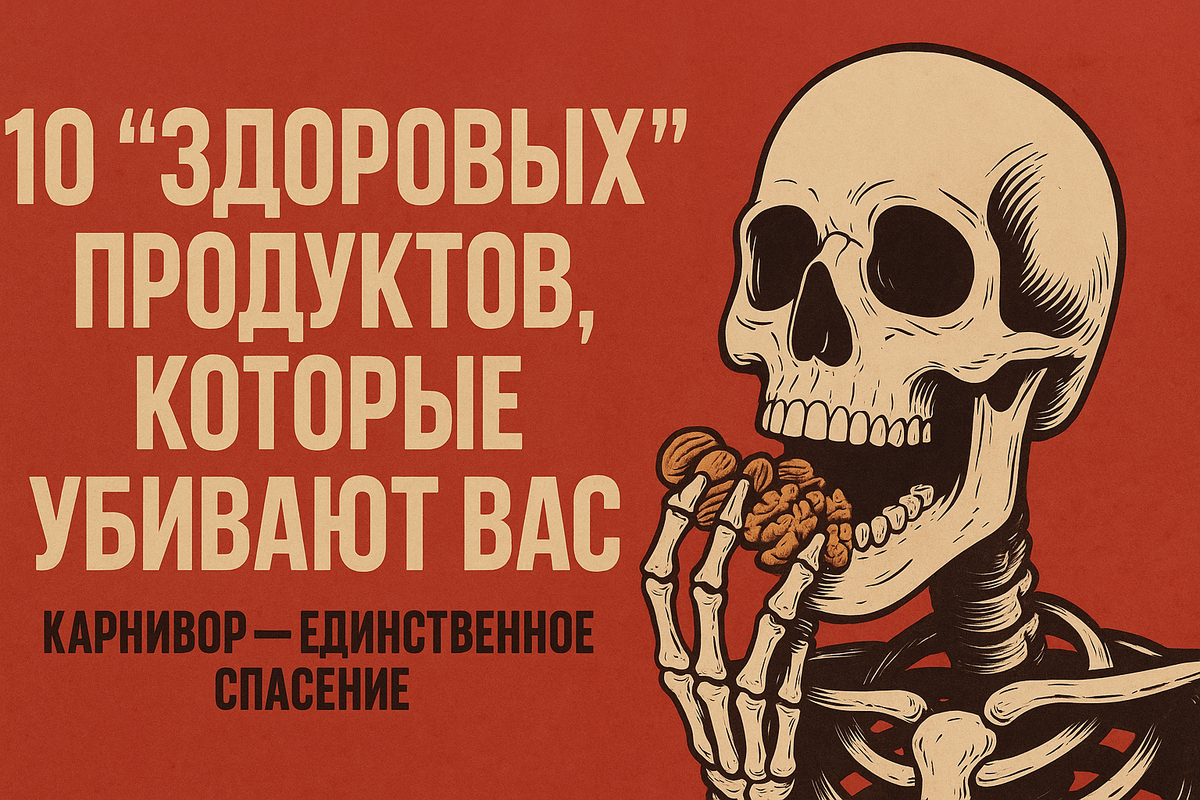 Эти продукты, созданные и продвигаемые индустрией, не дают здоровья. Они создают лишь его иллюзию, постепенно встраивая в организм хроническую усталость, системное воспаление, неумолимые гормональные сбои и преждевременное старение. Это и есть настоящий «пищевой заговор», цель которого — держать людей в состоянии перманентного недомогания, сделать их зависимыми от аптек, поликлиник и рекламных кампаний «здорового питания», которые предлагают очередное «чудодейственное» средство от проблем, созданных ими самими. Этот замкнутый круг выгоден лишь тем, кто продаёт нам лекарства от последствий. Пришло время сорвать маску с этих «здоровых» продуктов и увидеть их истинное лицо. Давайте разберём десять самых опасных мифов, которые тихо убивают нас, и посмотрим, почему только карнивор способен разорвать этот порочный круг и вернуть человеку его исконную силу.