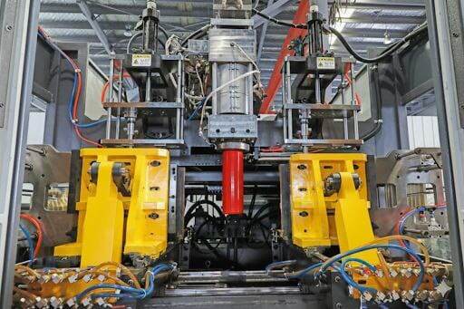 - Захват и выдув: Как только паризон достиг нужной длины, форма захлопывается, «кусая» паризон сверху и снизу. Внутрь заготовки вводится игла и подается сжатый воздух под высоким давлением.