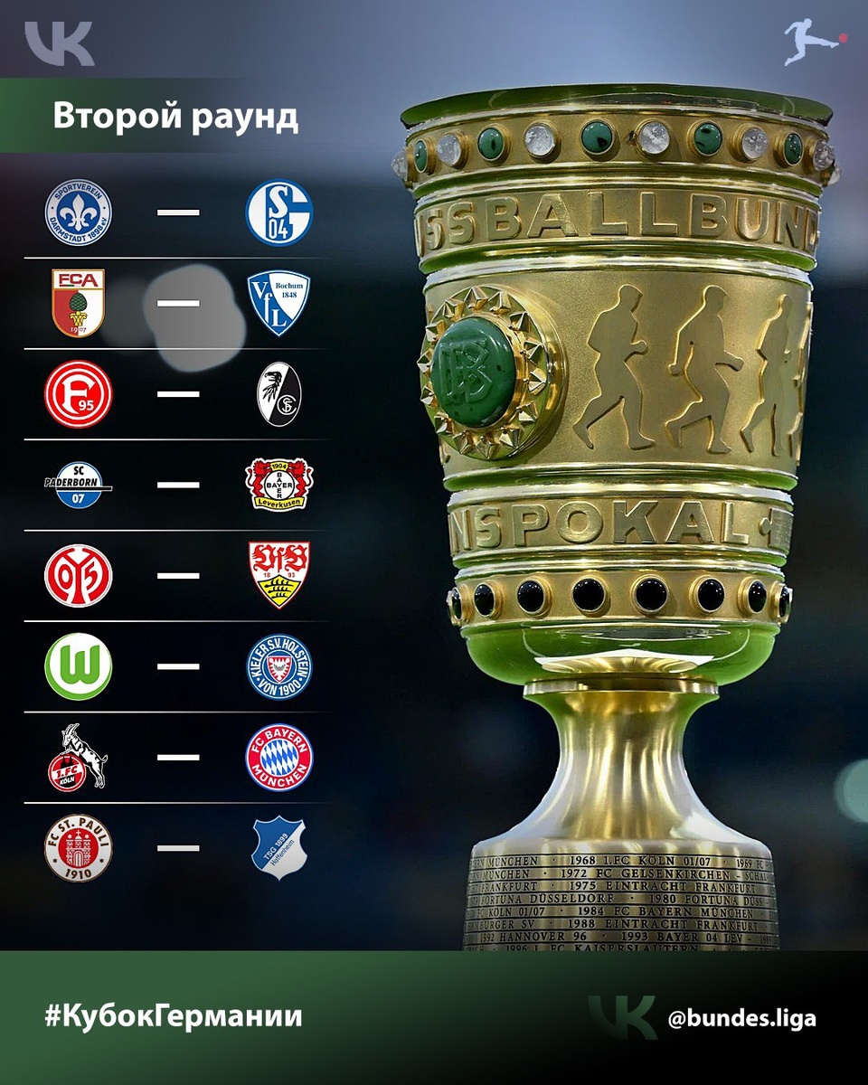 📝 Состоялась жеребьевка второго раунда Кубка Германии. Матчи будут сыграны 28 и 29 октября. «Дармштадт» — «Шальке» «Аугсбург» — «Бохум» «Фортуна Дюссельдорф» — «Фрайбург» «Падерборн» — «Байер» «Майнц» — «Штутгарт» «Вольфсбург» — «Хольштайн» «Кельн» — «Бавария» «Санкт-Паули» — «Хоффенхайм» «Иллертиссен» — «Магдебург» «Энерги Коттбус» — «РБ Лейпциг» «Унион Берлин» — «Арминия Билефельд» «Хайденхайм» — «Гамбург» «Боруссия Менхенгладбах» — «Карлсруэ» «Герта» — «Эльверсберг» «Гройтер Фюрт» — «Кайзерслаутерн» «Айнтрахт Франкфурт» — «Боруссия Дортмунд»
