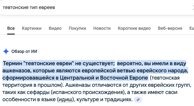 И одной из основных составляющих, а в некоторых аспектах главной были евреи тевтонского типа (или североевропейского типа или прагерманского). Слышали о таких? А вот исследователи начала 20-го века выделяли их отдельной строкой, сегодня же ИИ нагло заявляет