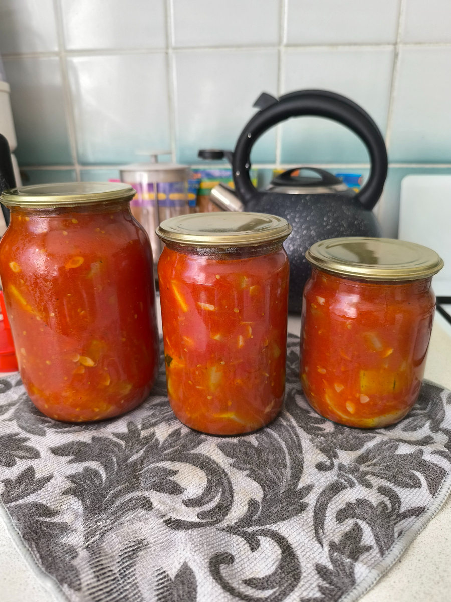 Тещин язык, я оч люблю эту закуску и всегда когда время кабачков её делаю, хорошая подгарнировка к макаронам и другим крупам. Закуска из кабачка "ТЁЩИН ЯЗЫК" Ингредиенты: ✓ Кабачки-1,2 кг ✓ Помидор -1,2 кг ✓ Перец болгарский - 3 шт ✓ Масло растит - 70 мл ✓ Соль - 1,5 ст л ✓ Сахар - 100 гр ✓ Уксус - 1,5 ст л ✓ Чеснок - 1 головка ✓ Перец острый - по желанию ( можно сухой) ✓ Специи какие любите, я положила 1 ч л Хмели Сунели 1 ч л красный молоты перец. 1. Помидоры на 15 минут залила кипятком а затем сняла кожицу. 2. Перец почистила и нарезала на кусочки. 3. Кабачок нарезала ломтиками ( примерно 0,5 см) тонко не надо, разварятся. 4. Помидор без кожицы вместе с перцем пропустила через мясорубку. Добавила соль, сахар, масло растительное, перемешала. 5. Поставила томатную смесь на огонь, после закипания проварила 10 минут. 6. Далее добавила кабачок и аккуратно перемешала, после закипания варить 15-20 минут чтоб кабачки дошли. 7. Затем добавить нарезанный чеснок и специи, варить на слабом