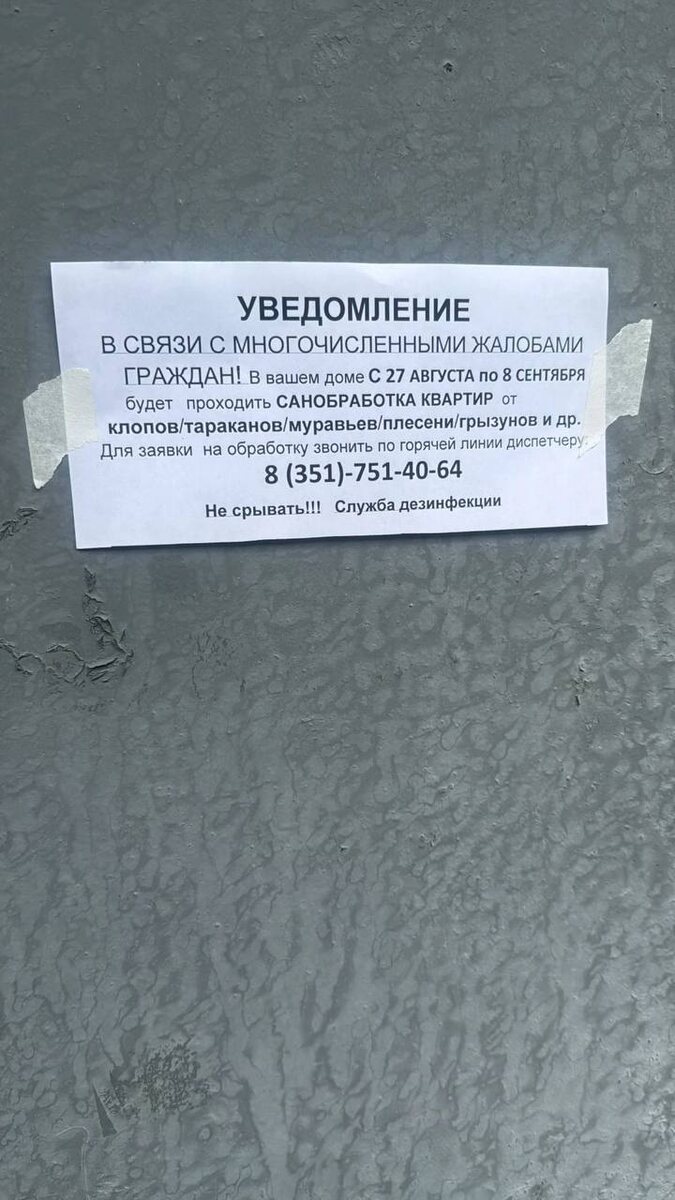 Управляющая компания «МКД-сервис 24/7» обращается к жителям многоквартирных домов по поводу объявлений на подъездах, в которых говорится о проведении обработки квартир от клопов и тараканов, плесени и муравьев в определенный период. Управляйка обращает внимание, что не имеет отношения к данным объявлениям.