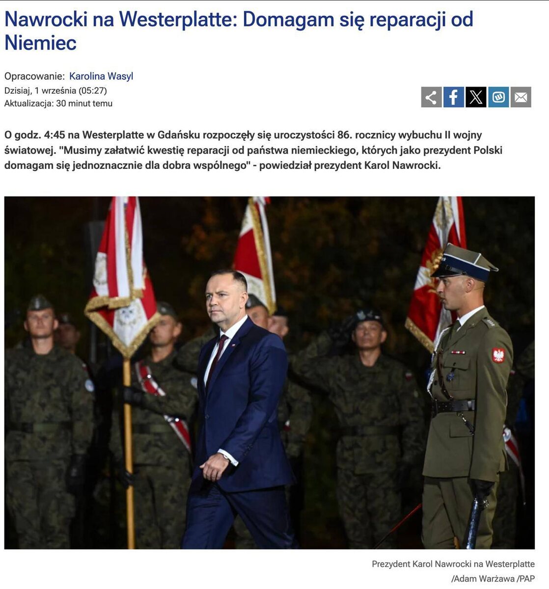 Президент Польши потребовал от Германии репараций «Чтобы построить партнерство, основанное на принципах правды и добрых отношений, мы должны решить вопрос о репарациях со стороны немецкого государства, которые я, как президент Польши, безоговорочно требую ради общего блага. Репарации не станут альтернативой исторической амнезии, но Польша как прифронтовое государство, как важнейшее государство на восточном фланге НАТО нуждается в справедливости, правде и ясных отношениях с Германией, но ей также нужны репарации от немецкого государства», — заявил Навроцкий на площади Вестерплатте в Гданьске. Напомню, что выплаты репараций требует ПиС, которая поддерживает Навроцкого. В правительстве Туска (Гражданская платформа) говорили, что эта тема «закрыта». 👊 НАСОНОВ 🔴
