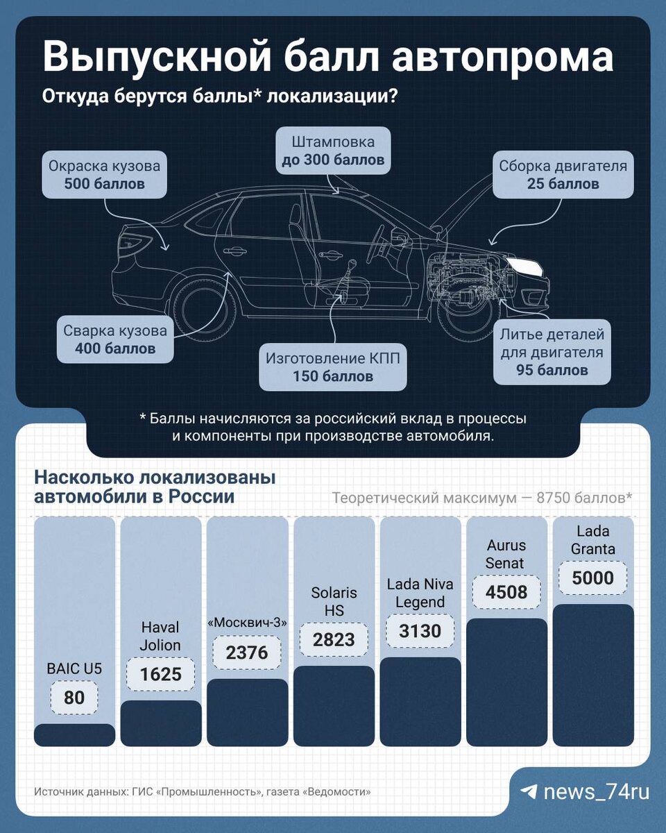 Китайские машины в России могут подешеветь Требования к локализации автомобилей, которые получают компенсацию утильсбора, радикально смягчаются, сообщают «Ведомости» со ссылкой на источник в Минпромторге. Это может снизить цены «чайнакаров» на 30-50%. 🟥Утильсбор. В 2023 году на новые авто он составлял около 178 тысяч, но спустя три фазы повышения подорожал до 667 тысяч. С января 2026 он составит 800 тысяч и выше. Утильсбор платят все производители, даже АВТОВАЗ, но местные сборщики получают полную или частичную компенсацию. Это зависит от уровня локализации, которая оценивается в условных баллах Минпромторга. 🟥Что это за баллы? Они начисляются за российские компоненты и вклад в производство автомобиля внутри страны. За разные этапы сборки дается разное количество. Например, за сварку кузова — 400 баллов, за сборку двигателя — 25, за штамповку — до 300. В карточке показали уровни локализации машин, по данным Минпромторга ⬆️ 🟥Что поменяется. Сейчас для «кешбэка» достаточно набра