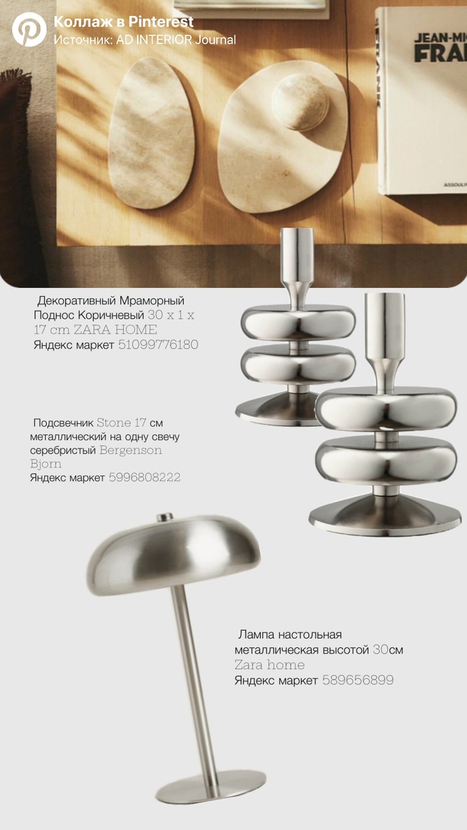 - Металл рифмуется с подсвечником (п.2), а тёплые отражения на абажуре подсвечивают прожилки мрамора (п.1).