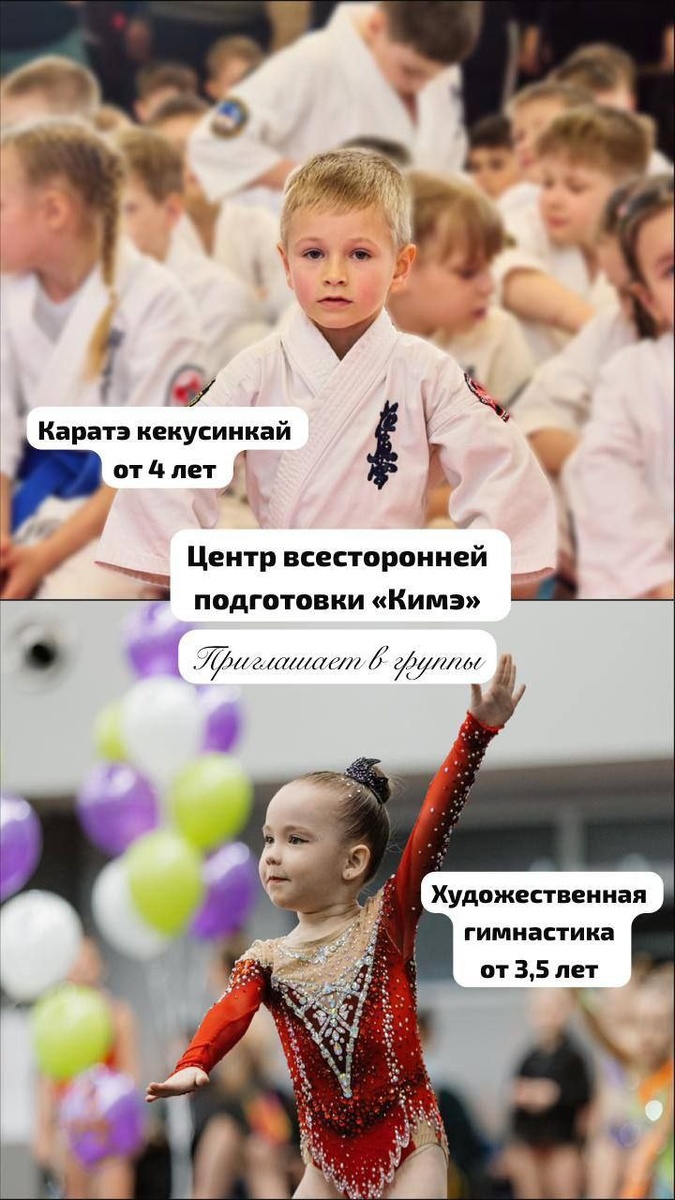 📣Новый набор в группы на сентябрь Центр всесторонней подготовки «Кимэ» 📍Нестерова, 12 (Борисенко, остановка Клубная) 🔥Пробная тренировка - бесплатно 👧🏻 У нас тренировки для детей: -Карате кекусинкай от 4 лет ; -Художественная гимнастика от 3,5 лет. 🧘♀️ Направления для взрослых: -Каратэ кекусинкай; -Аэройога в гамаках; -Растяжка; -Силовые тренировки; -Здоровая спина. Есть возможность совместить тренировку для мамы и ребенка 👦🧘♀️ ❗️По Всем интересующим вопросам звонить или писать на WhatsApp 📱 89020583757