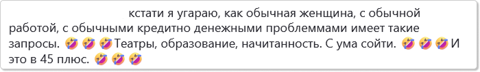 Узнала тут о себе, что я, оказывается, она. Причем претендую на столько всего запредельного, что обалдеть просто! Судите сами: Я, правда, не очень поняла, у кого именно я запрашиваю театры, образование и начитанность. У судьбы для себя? Кагбэ поздно просить - все уже есть у меня. У авторов этих строк? Точно нет - там весь максимум образования на освоении смайликов остановился, очевидно. У... У кого еще? Дальше моего полета фантазии не хватает даже предположить, но дело не в этом. Меня, собственно, подборка удивила. Хотеть театры - это сейчас какой-то завышенный уровень требований, иметь право желать которого еще заслужить надо, заработать кровавыми мозолями или дворянским происхождением? Уж что-что, а театр вообще с самого начала своего народным жанром считался, и цена на билеты давно с киношными сравнялась. Кино - тоже роскошь, доступная только аристократам? "Кабы он просил, злодей, лососины да груздей!" Ладно б назвали щЮчкой меркантильной, которая когти тянет к чужим квартирам в Си