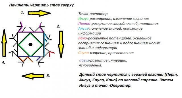СТАВ ДЛЯ РАСКРЫТИЯ ТАЛАНТОВ И СПОСОБНОСТЕЙ Автор: Kuka 🅰🅰🅰🅰 🤍🤍🤍🤍🤍🤍🤍 🤍Описание Рун в картинке 🤍Рабочие Руны выделены разными цветами. 🤍Наносить надо начиная с верхней вязанки (Перт+Ансуз+Лагуз+Соуло+Кано) по часовой стрелке. Это обязательное условие, так как именно Перт начинает работу по раскрытию способностей и талантов 🤩Предупреждение 🤍При работе става могут возникнуть ноющие головные боли. Это нормально для работы именно этого става. Будет идти трансформация блоков. 🤍Если боли будут не выносимыми, рекомендую применить став "Отменяющий" уважаемого автора Cantas на отмену блоков, мешающих работе става. Формула прошла неоднократное тестирование. Тестирование прошло успешно. #руны #руническиеставы Ваш наставник, Екатерина Автор канала: @katymagic_space