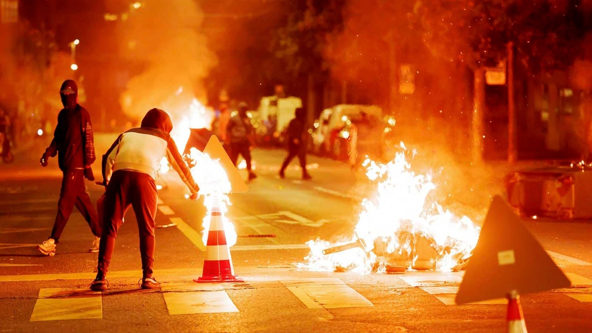 Молодые люди в масках, преимущественно афроамериканцы, поджигают мусорные контейнеры, разрушают автобусы, автомобили и громят магазины. Столкновения с полицией становятся всё более агрессивными: фейерверки, бутылки с коктейлями Молотова и камни летят в правоохранителей. Полицейские, в свою очередь, применяют слезоточивый газ и водометы, но пока ситуация остаётся без контроля.