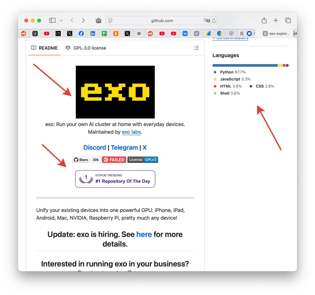 exo - бесплатное ПО, позволяющем объединить разные устройства в один мощный кластер для запуска моделей искусственного интеллекта