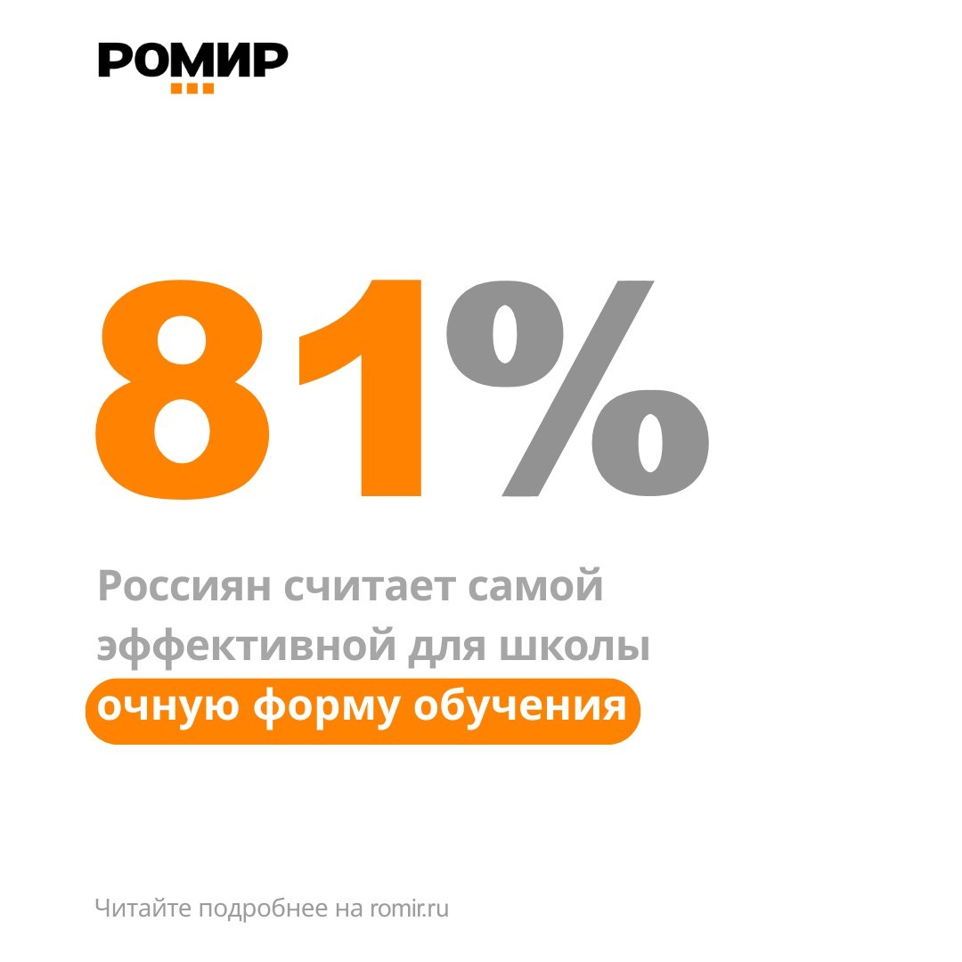 Большинство россиян (81%) считают очную форму обучения наиболее эффективной для современных школьников, что демонстрирует высокую ценность живого общения, непосредственного контакта с учителем и одноклассниками. Форму смешанную, сочетающую элементы дистанционного и очного форматов, поддерживают 13% респондентов. При этом дистанционный формат признают наиболее эффективным лишь 2% россиян.