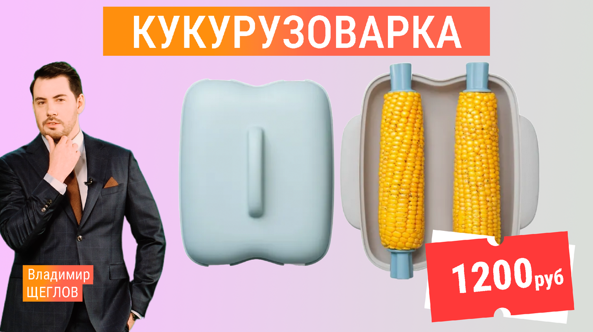 "Сегодня мы проверим кукурузоварку — устройство для приготовления кукурузы в микроволновке без воды и посуды," - радуется журналист, ведущий "Самой полезной программы" Владимир Щеглов. Прибор стоимостью 1200 рублей представляет собой пластиковый контейнер с поддоном, крышкой и двумя держателями для початков. Рассчитан он строго на 2 початка длиной до 20 см — более крупная кукуруза в него просто не поместится. Мы взяли 4 одинаковых початка кукурузы. Два приготовили традиционным способом в кастрюле, а два — в кукурузоварке. Процесс приготовления в устройстве прост: 1. Отрезаем хвостики от кукурузы 2. Вкручиваем в початки держатели 3. Размещаем на поддоне и закрываем крышкой 4. Ставим в микроволновку на максимальную мощность Производитель обещает готовность за 7 минут. Однако на практике кукуруза не дошла до нужной кондиции — пришлось держать ее еще 5 минут. Итого: 12 минут вместо заявленных 7. В кастрюле же процесс занял: Кукуруза из кастрюли получилась идеальной — мягкой, сочной и пол
