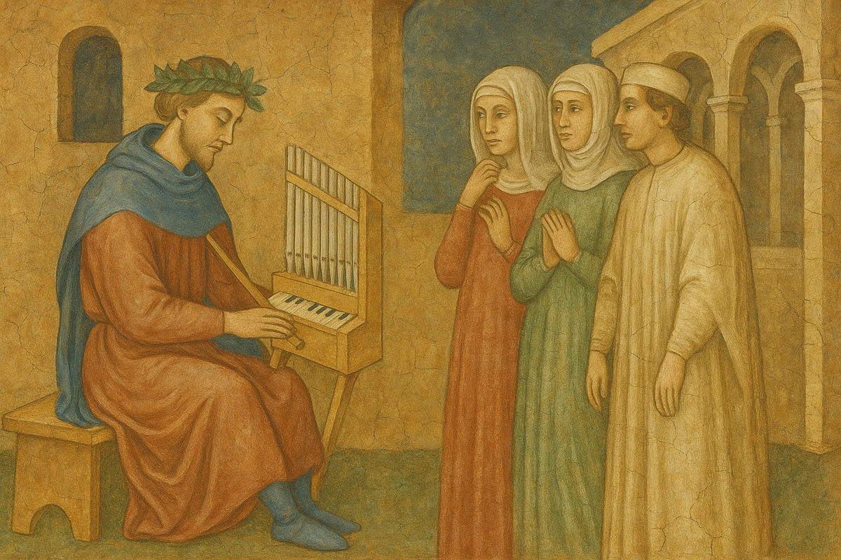 2 сентября 1397 года Флоренция простилась с Франческо Ландини — слепым с детства композитором и виртуозом на портативном органе, органетто. Этот небольшой инструмент носили на ремне: одной рукой музыкант качал мех, другой играл на узкой клавиатуре.