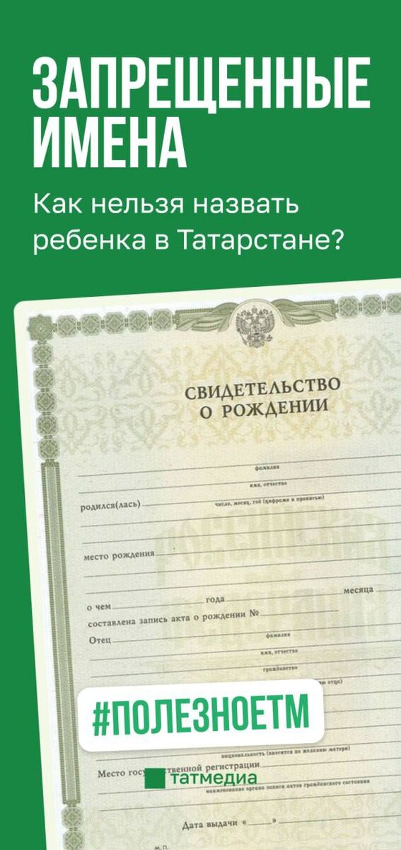 В ответ на пост 🇷🇺👨👩👧👦 Какие имена нельзя давать детям в Татарстане При появлении на свет ребенка перед родителями встает вопрос о выборе имени для новорожденного. Но существуют определенные ограничения по выбору имени для ребенка, подробнее – в карточках. #ПолезноеТМ @tatmediaofficial | Все каналы Татмедиа
