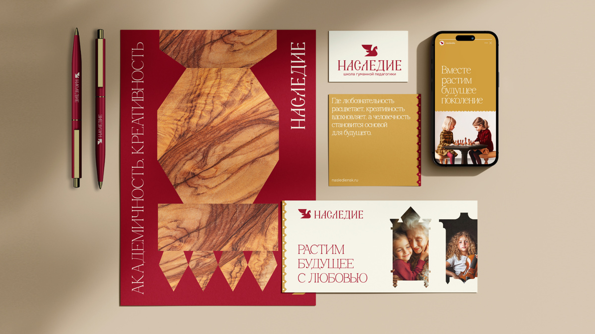«Наследие» — это не просто школа. Это целый образовательный мир: частный детский сад, начальная и средняя школа, бизнес-школа для детей. Все под кураторством гуманной педагогики — направления, где в центре внимания находится личность. Вне зависимости от возраста. Здесь воспитание — это когда на тебя смотрят не сверху вниз, а когда вы идете плечом к плечу: родители, учителя и ученики. Эта школа про личный пример, глубокую связь поколений и культурное наследие. Она создается людьми, которые влюблены в свое дело. Не просто профессионалы, а настоящие носители философии. Создать айдентику, которая: – говорит на языке традиций, но звучит современно; – вызывает эмоции у детей и взрослых; – отражает суть школы — особенное место, где важна личность и преемственность. В «Наследие» идут те, кто хочет дать ребенку не просто знания, а среду — наполненную вниманием, культурой и уважением. Кто считает, что образование — это не сервис или услуга, а со-творчество. Это семьи, которым важны корни, но инт