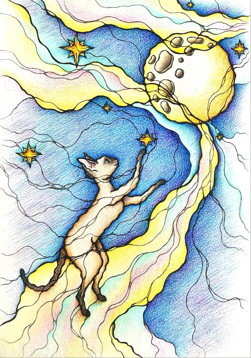 Лана Евган: "Доброго времени суток, друзья🤗 Не смогла пройти мимо такой чудесной темы конкурса! Кошки, это, конечно, моя любовь. Да и в прикреплённых примерах к анонсу конкурса есть и моя Фуфелька) Думаю, что многие из вас, кто здесь, в чате Чистого листа, давно, помнят историю, как я её нарисовала себе☺️ Тогда это было первое сбывшееся через нейрографику желание✨ Не цель, не задача, а именно желание)) С тех пор многое уже нарисовалось и воплотилось. Но комочек кудрявого счастья, именно такой, как мне мечталось, каждый день служит живым напоминаем того, что возможно всё, даже дотянуться до звезд!😻✨✨✨ По лунной дорожке гуляет кошка, Её так манит Млечный Путь. И надо кошке совсем немножко, Тепла и ласки, еды, уют. Играет кошка, средь звезд резвится Она не знает, что я смотрю, Как в темном небе её искрится Кудрявая шубка, вот сон на яву!" " 🔥🔥Каталог Курсов Школы Нейрографики "Чистый Лист" neurograficaschool.ru/ Приобрести можно из любой страны.