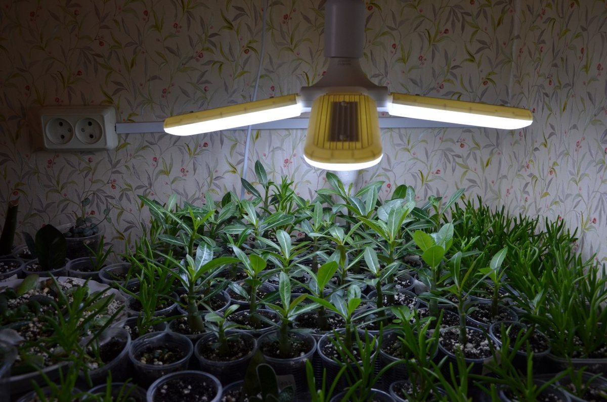 Привет-привет! 😊 Сегодня поговорим об одном из самых красивых комнатных растений – адениуме (или как его ещё называют «пустынная роза»). У него шикарные цветы, необычные стволы и вообще он выглядит ну просто космически! Но вот какая штука – адениумам нужен прям очень яркий свет, иначе они начинают грустнеть и чахнуть 🙁. И тут возникает вопрос: что делать, если солнца мало или совсем нет? Ответ простой – подсветка! Сколько света надо? Адениумы обожают солнце так же сильно, как мы мороженку жарким летом 😎 Для нормального роста им нужно минимум 50 Вт освещения на квадратный метр, но вообще чем больше, тем лучше – оптимально 70-100 Вт. Только представьте себе этот яркий солнышко прямо у вас дома ☀️ 💡 Важно понимать, что речь идёт именно о полезной освещённости для растения, а не о мощности лампочки по электрическому потреблению. Какие лампы выбрать? Если вы думаете, что вам нужны какие-то специальные фитолампы за кучу денег – расслабьтесь! Вполне подойдут обычные светодиодные лам