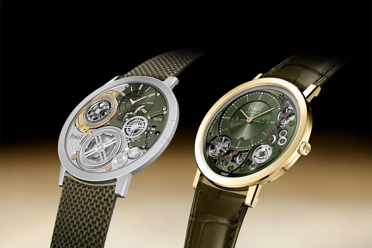 В мире высокого часового искусства Piaget уже много лет синонимичен изяществу и рекордной тонкости. Два новых воплощения культовых моделей бренда — автоматического Altiplano 910P и феноменального "ручнозаводного" Ultimate Concept Tourbillon — доказывают, что техническая сложность может быть невероятно стильной. Наследник традиций: Altiplano 910P Khaki Green На этот раз легендарная механика облачена в смелый трендовый дуэт хаки+золото. Модель Altiplano 910P, впервые представленная в 2018 году, произвела фурор, став самым тонким автоматическим часовым механизмом в мире толщиной всего 4.3 мм. Его прародителями были революционные калибры 9P (1957 г.) и 12P (1960 г.), заложившие основу ультратонкого часового мастерства Piaget. Секрет невероятной тонкости калибра 910P, и соответственно, корпуса часов, кроется в двух инновационных решениях: В новой версии эта техническая красота предстает в