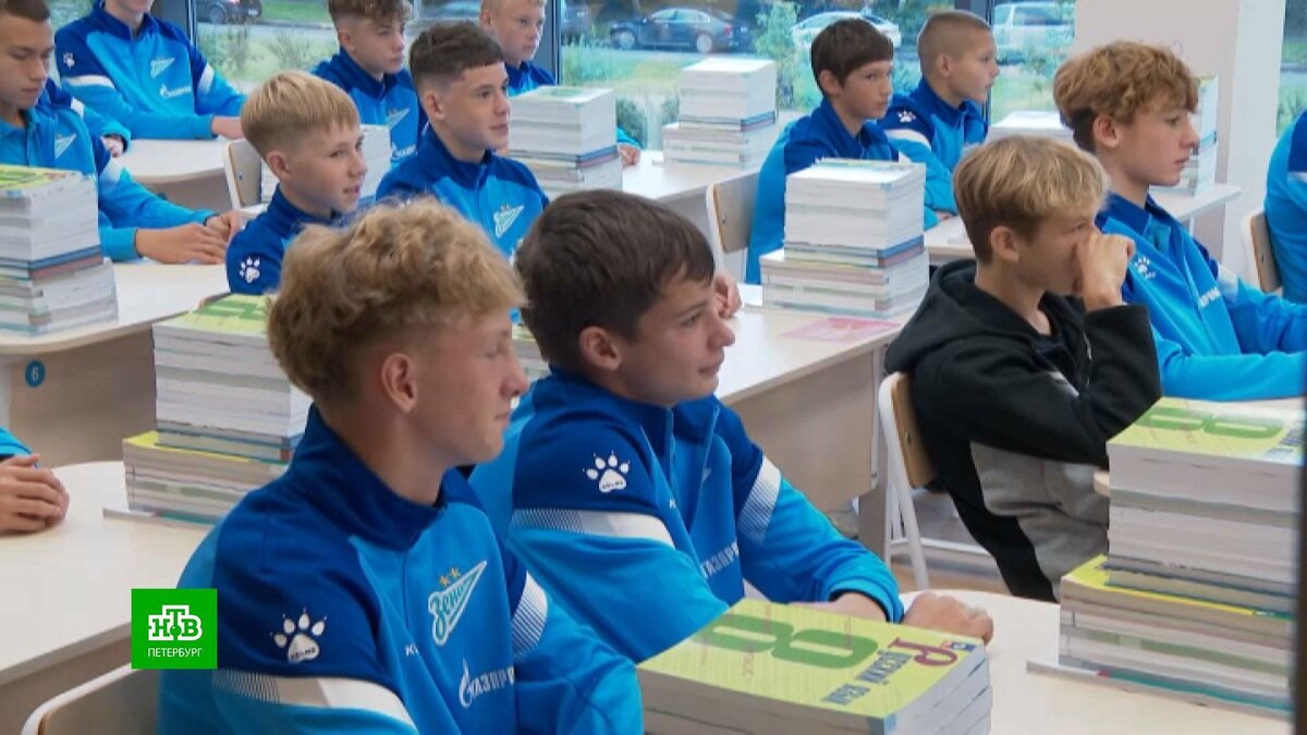 [ Смотреть видео на сайте НТВ ] Обучение и футбол в одном месте. В День знаний петербургский «Зенит» открыл общеобразовательную школу. Она располагается на территории клубной академии в Калининском районе. В ней будут обучаться около 170 воспитанников. Пока коридоры учреждения выглядят полупустыми, но это только потому, что в каждой параллели всего по одному классу — с 6-го по 11-й. Примечательно, что за партами сидят исключительно мальчики. Кабинеты оснащены самыми современными технологиями, необходимыми для образовательной деятельности. Получать знания ребята будут на втором и третьем этажах. Первый уровень — своеобразное подтрибунное помещение, где располагаются раздевалки, судейские, медицинский блок и прямой выход на манеж. Объединяя образование и спортивную подготовку, «Зенит» делает упор на всестороннее развитие юных футболистов. Елена Илюхина, председатель совета директоров ФК «Зенит»: «Средняя общеобразовательная школа и не могла подстраиваться под процесс спортивного характер