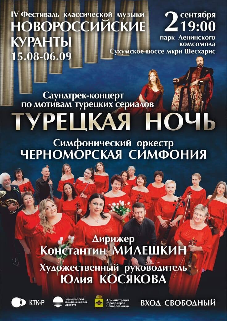 🎶 ТУРЕЦКАЯ НОЧЬ В НОВОРОССИЙСКЕ! 🇹🇷✨ 2 сентября | 19:00 | Парк им. Ленинского комсомола Фестиваль «Новороссийские куранты» продолжает наполнять город музыкой! 🌙 В этот вечер мы вместе перенесёмся в мир восточной магии, нежной любви, древних дворцов и страстных историй. Турецкая ночь — это музыкальное путешествие сквозь любимые сериалы. 🎶 Прозвучат саундтреки, которые оживят сцены из «Великолепного века», «Черной любви», «Королька – птички певчей», «Запретной любви» и других известных турецких теленовелл. На фоне — видеоряд, погружающий в атмосферу сериала. 🎻 Всё это — в исполнении Черноморской симфонии, которая уже несколько лет дарит городу настоящий музыкальный марафон в рамках фестиваля. 🎼 За дирижерским пультом — наш талантливый маэстро, вдохновляющий лидер и сердце коллектива — Константин Милёшкин. 📍 Где: Парк им. Ленинского комсомола 🕖 Когда: 2 сентября, 19:00 🎫 Вход свободный Приходите всей семьёй — почувствуйте, как Турция становится ближе, а музыка объединяет п