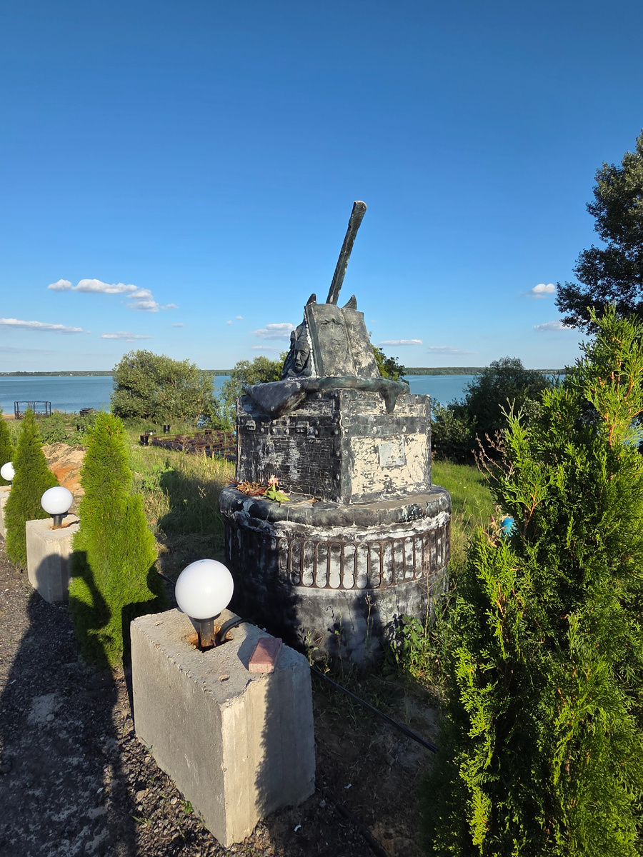 Проезжали однажды мимо Воронежской плотины в районе Шиловского леса в поисках дороги на Шиловский плацдарм (об этом писала вот здесь: По пути увидели вывеску "База отдыха "Набережная №1". Время было обеденное, решили заехать перекусить. И вот перед входом на территорию базы увидели необычную композицию. Две маски, сундук, книга, с другого ракурса понимаешь, что там есть гитара. Лежат засохшие цветы. Предположение, что это памятник бродячим артистам, будет довольно странным, учитывая его местонахождение на берегу Воронежского водохранилища рядом с дамбой. Состояние оставляет желать лучшего, никаких табличек, кому она посвящена, нет. Погуглив информацию в интернете, выяснили, что это - памятник лидеру группы «Король и Шут» Михаилу Горшенёву. Изначально памятник был установлен в Коминтерновском районе Воронежа в ноябре 2014 года после смерти лидера группы. Её создал воронежский мастер Андрей Терёхин. По словам скульптора, каждый предмет в памятнике имеет символическое значение. Напри