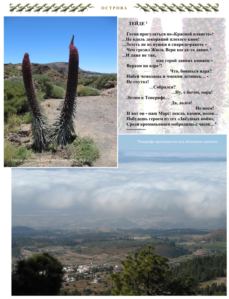 На фотографиях: цветы-эндемики Национального парка Тейде, Тенерифе просыпается под облачным одеялом. *** Готов прогуляться по «Красной планете»? …Не вдоль декораций плохого кино! …Лететь не из пушки в снаряде-ракете - Чем грезил Жюль Верн когда-то давно. . …И даже не так, как герой давних книжек - Верхом на ядре! Что, боишься ядра? Набей чемоданы и чмокни детишек… - Не спутал! …Собрался? …Ну, с богом, пора! . Летим к Тенерифе… Да, долго! Не ноем! И вот он - наш Марс: пекло, камни, песок… Побудешь героем из тех «Звёздных войн», Среди кроманьонцев побродишь с часок … ~~~~~~~~ /Встречаются в тексте: – Тейде - действующий вулкан на о.Тенерифе (Канарские о-ва). Высота 3718 м. В нижнем кратере вулкана Тейде снимались сцены для фильмов «Звёздные войны» и «Миллион лет до нашей эры». – Жюль Верн (1828-1905) - французский писатель, один из создателей жанра научной фантастики. В романе «С Земли на Луну» (1865) его героев отправили в космос внутри пушечного снаряда. – Барон Мюнхгаузен - герой кни