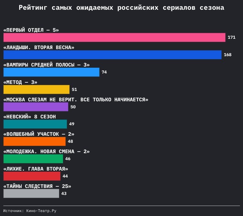 «Мы впервые решили измерить зрительский интерес к будущим сериалам. Понятно, что проекты находятся в неравных условиях: одни выходят буквально в ближайшие недели, другие заявлены только на следующий год; кто-то активно ведет промокампанию, а кто-то ограничился пока лишь общим анонсом. Именно поэтому мы, например, не учитывали просмотры трейлеров — у многих их пока просто нет. Тем не менее результаты получились показательными. Особенно захватывающе было наблюдать за своеобразной битвой за первое место между теле- и стриминговым проектом — это отчетливо показывает, что такие сериалы сегодня соревнуются на равных. Очень порадовало жанровое разнообразие рейтинга: зрителей сегодня неожиданно привлекают не только детективы и боевики, но и, например, музыкальные драмы. Еще интересно, что режиссер Юрий Быков, например, фигурирует сразу в двух проектах рейтинга. Для нас самих многие цифры оказались неожиданными. Сезон только начинается, и будет интересно посмотреть, какие премьеры оправдают ожидания зрителей», — отмечает главный редактор портала Кино-Театр.Ру Жан Просянов. Рейтинг возглавили сразу два продолжения громких сериалов, разрыв между которыми оказался минимальным, что фактически у исследования получилось два лидера. С показателем ожидания 171 чуть впереди оказался 5-й сезон детектива НТВ «Первый отдел». На презентации телеканала 28 августа генеральный продюсер Тимур Вайнштейн отметил, что четвертый сезон сериала стал самым успешным проектом последних четырех лет в аудитории 18+. Дата премьеры нового сезона с Иваном Колесниковым и Сергеем Жарковым в главных ролях пока не анонсирована. Буквально в полушаге от него, первой среди стриминговых проектов, идет музыкальная драма «Ландыши. Вторая весна» (168 баллов), продолжение одного из самых популярных и обсуждаемых проектов последних лет — «Ландыши. Такая нежная любовь», созданного при поддержке Института развития интернета. Новый сезон уже вызвал рекордный интерес в медиапространстве, а в соцсетях зрители активно «ищут» главного героя Леху. Премьера состоится на Wink.ru, точная дата пока не объявлена. Тройку лидеров замыкает третий сезон сериала онлайн-кинотеатра START «Вампиры средней полосы», который завершит историю семьи смоленских кровопийц. К своим ролям вновь вернутся Юрий Стоянов, Артем Ткаченко, Дмитрий Чеботарев, Дмитрий Лысенков, Татьяна Догилева и другие. Его показатель равен 74. Ниже в рейтинге третий сезон «Метода» (показатель 51), где Константин Хабенский вновь возвращается к роли следователя Родиона Меглина. К нему присоединятся в том числе Никита Кологривый и Лев Зулькарнаев. Над продолжением работает команда первого сезона под руководством режиссера Юрия Быкова (премьера осенью на Кинопоиске). Пятое место занимает новый проект — сериал Жоры Крыжовникова и Ольги Долматовской «Москва слезам не верит. Все только начинается» (Wink), единственный «дебютант» среди лидеров рейтинга с несколькими сезонами за плечами. Премьера проекта, созданного при поддержке ИРИ, состоится уже на этой неделе, 4 сентября. Сериал является переосмыслением оскароносной ленты Владимира Меньшова, причем в жанре мюзикла. Он получил 50 баллов в рейтинге.