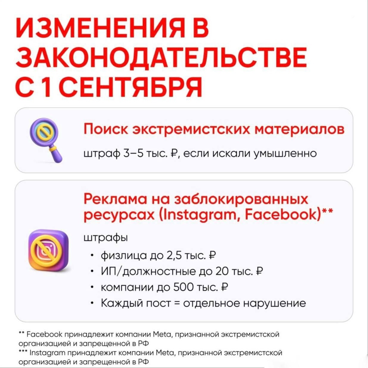 С 1 сентября жизнь россиян кардинально изменилась. Вступил в силу целый пакет новых запретов, штрафов и ограничений: — Запрещён поиск экстремистских материалов в интернете — штраф до 5 тысяч рублей. — Реклама VPN под запретом, штраф — до 500 тысяч рублей. — Любая реклама в Instagram* теперь запрещена, штраф — до 500 тысяч рублей. — Банки начали жёстче контролировать снятие наличных. Подозрительные операции блокируют, а выдачу могут ограничить до 50 тысяч рублей в сутки на 48 часов. — Зажигалки продают только по паспорту, штраф за нарушение — до 2 млн рублей. — Госпошлины для автомобилистов взлетели до 300%. — Россиянам с психическими расстройствами, аутизмом и болезнью глаз запретят водить авто. — Водителей будут штрафовать до 100 тысяч рублей за небезопасную перевозку детей: разрешены только автокресла, а лямки, адаптеры и бескаркасные кресла запрещены. — За отказ пропустить машины силовиков и чиновников с мигалками грозит лишение прав. — За отказ от медицинского освидетельствова