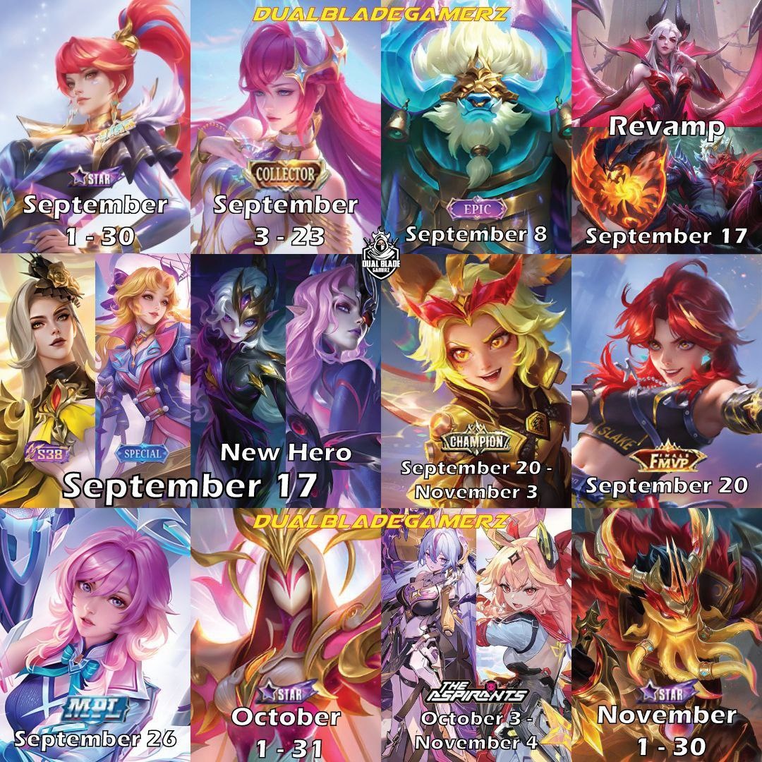 📅 Сентябрь – Ноябрь: расписание скинов 1 – 30 сентября Ханаби — Chic Glamour [Starlight] 3 – 23 сентября Новария — Dragonsworn [Collector] Хуфра — Volcanic Overlord (Revamp) Джаухед — Samurai Mech (Revamp) 6 сентября – 7 октября Флорин — Fluffy Dream Чан’э — Moon Artist Клод — Bad Bro Ангела — Heartstring 8 сентября Минотавр — Nether Overseer [Epic] 17 сентября Тхамуз — (Revamp) Алиса — (Revamp) Дирот — (Revamp) Обсидия — Sovereign of Dark's End [WB] Обсидия — Undying Remnants Валентина — Grand Gala [S38] Кагура — Lady Parasol [Special] 20 сентября – 3 ноября Джой — ONIC PH [Champion] Беатрис — FMVP (название пока неизвестно) 26 сентября Лунокc — Quantum Polarity [MPL] 1 – 31 октября Ив — Flame Lotus [Starlight] 3 октября – 4 ноября Гвиневра — Daybreak Halo Вексана — Twilight Star 9 октября (9-летие MLBB) Сиси — P.ACE Фанни — P.ACE Лолита — Angelic Fan Чжусин — P.ACE 1 – 30 ноября Бейн — Lord of Scalding Seas [Starlight] Выгодно и быстро пополнить алмазы Вы можете в нашем