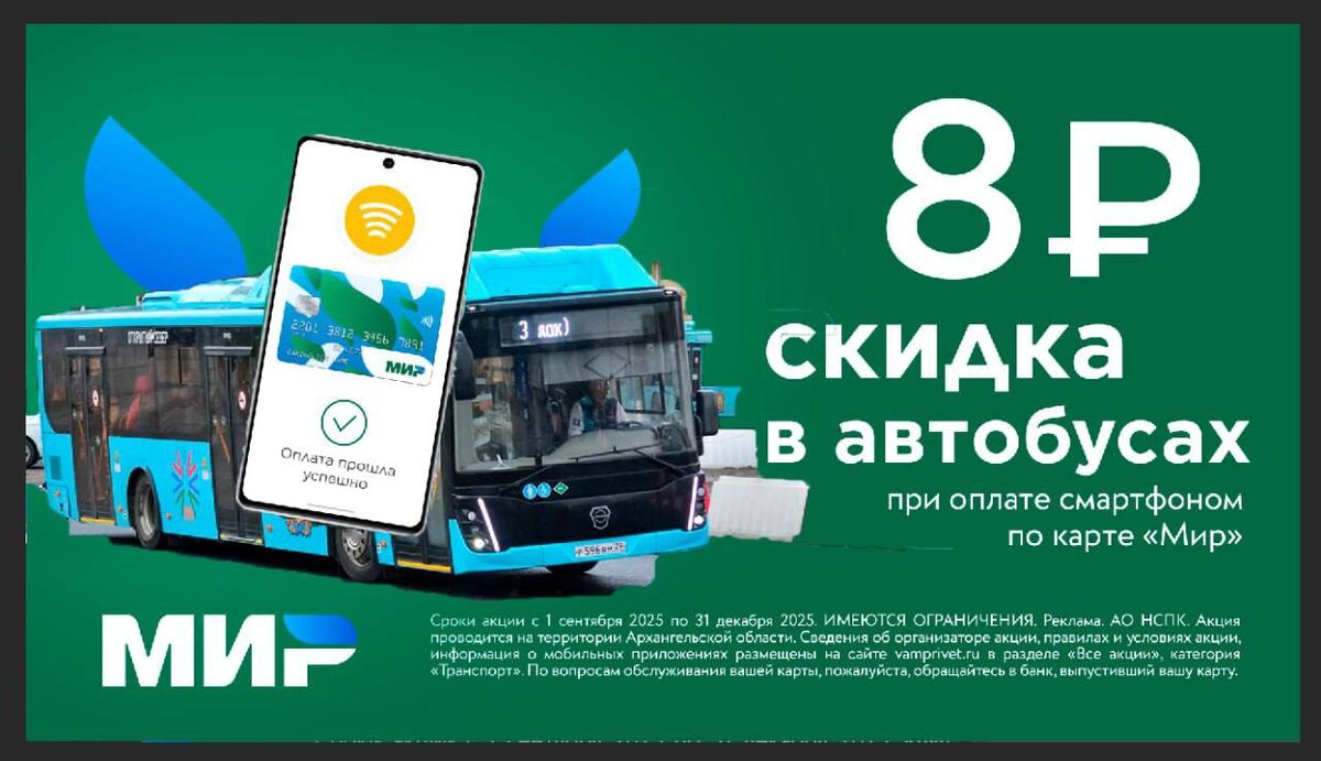 ПРОЕЗД в автобусах для держателей карты «МИР» подешевеет на 8 рублей! С 1 сентября по 31 декабря 2025 года жители и гости Архангельской области смогут экономить на проезде в автобусах при оплате смартфоном. Совместно с платежной системой «Мир» запущена акция, в рамках которой при оплате проезда картой «Мир», загруженной в смартфон через приложение Mir Pay, предоставляется скидка 8 рублей на каждый билет. Чтобы воспользоваться скидкой, необходимо скачать приложение Mir Pay. Получить ответы на вопросы и помощь по использованию приложения можно по ссылке Подробная информация об акции доступна на сайте.