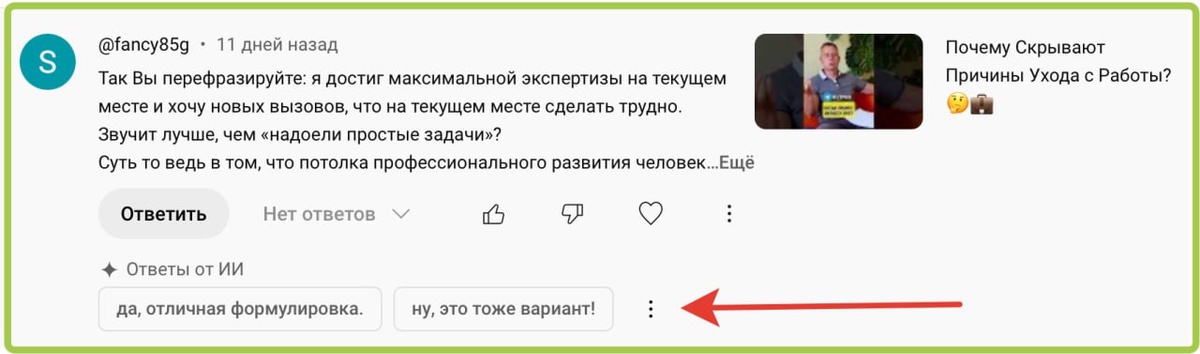 Теперь вы можете отвечать на комментарии на вашем канале YouTube просто нажимая подходящий вариант ответа от ИИ :) См. картинку. Признаюсь, я иногда так делаю, т.к. не очень вежливо не отвечать, а времени не всегда хватает - а тут просто клик и ответил. Иногда там развернутые ИИ- ответы, но безвкусные - типа вода мокрая, я с вами согласен :) Нас приучают к лени... Русский ИТ бизнес