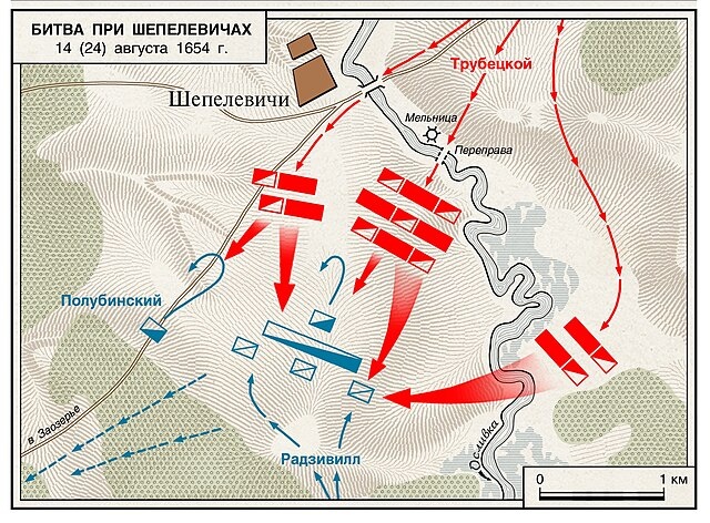 24 августа 1654 г. состоялась знаменательная битва между русскими и польскими войсками у села Шепелевичи (ныне Могилёвская область Республики Беларусь). Русскими войсками командовал князь Алексей Никитич Трубецкой (1600-1680). К моменту битвы под Шепелевичами он уже отличился в Русско-польской войне 1654-1667 гг.: - 27 июня 1654 г. взял Рославль (ныне Смоленская область РФ); - 12 июля 1654 г. взял Мстиславль (ныне Могилёвская область Республики Беларусь) – в ходе штурма потери поляков составили 15.000 убитых (и военных, и гражданских). Русские войска вышли к Днепру. Одновременно русские войска взяли в осаду Смоленск (был захвачен Речью Посполитой в ходе Смуты в 1611 г.). Польской армией под командованием Великого гетмана Литовского Януша Радзивилла (1612-1655) была поставлена задача прийти на помощь Смоленску и заставить отступить русские войска. В составе армии были кроме поляков и литовцев, ещё немцы, венгры, реестровые казаки. Битва началась утром 24 августа 1654 г. Поляки и литовцы