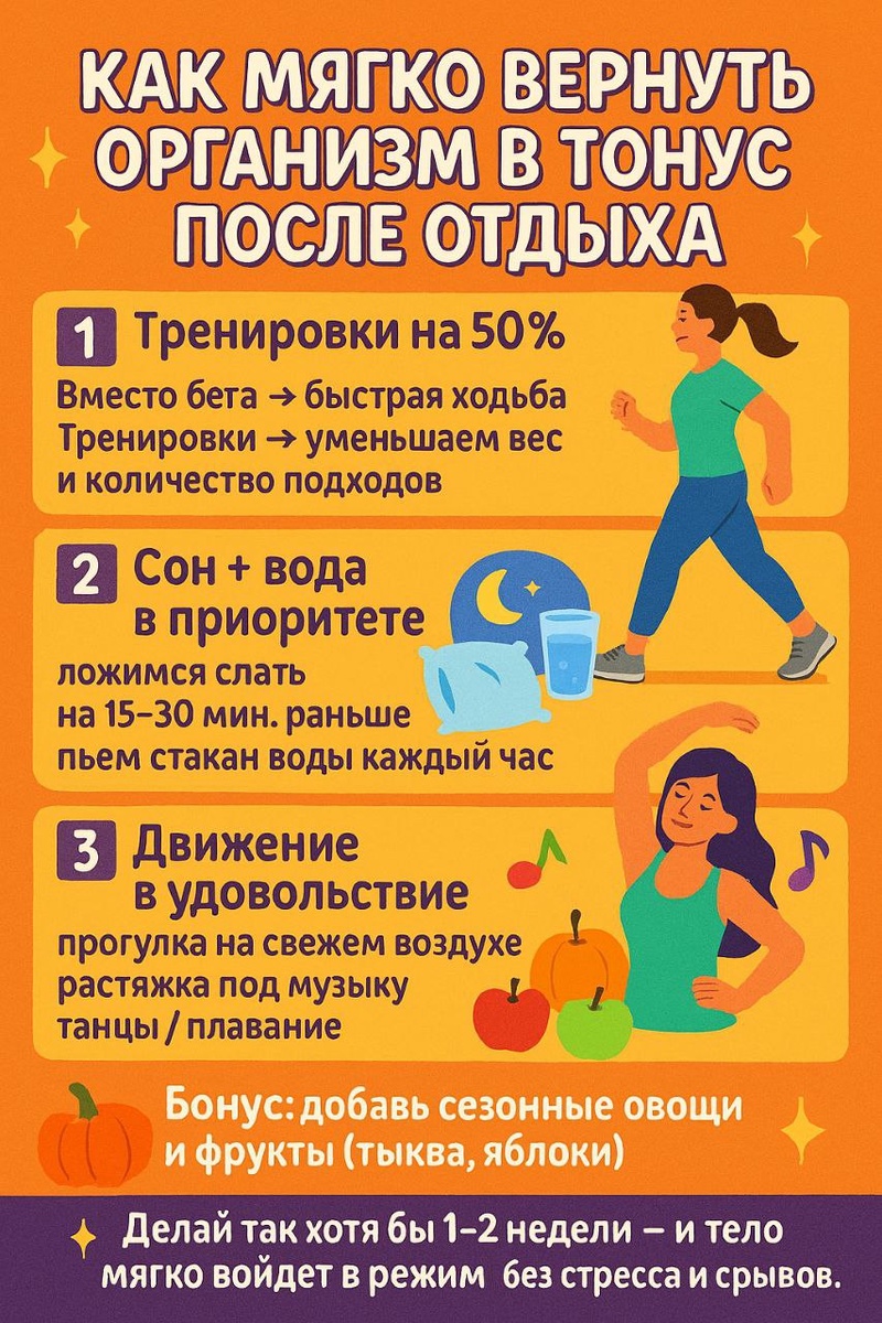 Как мягко вернуть организм в тонус после отдыха: 3 рабочих способа без стресса После отпуска у многих появляется желание "начать новую жизнь": строгая диета, жёсткие тренировки, планы "с понедельника всё поменяю!". Но… именно так запускается стресс, срывы и чувство вины. Ваш организм - не машина. Он прошёл путь перезагрузки: смена режима, другая еда, поездки. Ему нужна мягкая адаптация, а не рывок. Вот 3 способа, которые помогут вернуться в тонус без стресса и откатов 👇 1. Тренируйтесь на 50% от привычного Не нужно сразу повторять прошлые рекорды. Дайте телу "войти в поток". 👉 Если бегали - начните с быстрой ходьбы. 👉 Тренировки - уменьшите веса в 2 раза и сделайте меньше подходов. ✅ Так мозг воспринимает задачу как "лёгкую" → появляется мотивация, нет выгорания. 2. Сначала сон и вода - потом спорт Энергия рождается не в зале, а в восстановлении. 👉 Ложитесь на 15-30 мин. раньше. 👉 Поставьте воду на видное место и пейте каждый час. ✅ Сон восстанавливает гормональный фон,