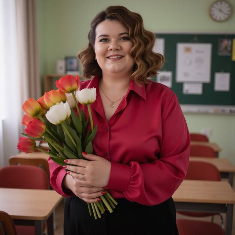 Все фото выше не настоящие, а сгенерированные нейросетью 🤯 И знаете, это прям находка! Часто в классе или дома плохое освещение, фотографии от родителей не всегда удачные, а новых снимков просто нет. А фотосессия в студии с фотографом… дорого и не всегда реально. Слава богу, теперь есть такие инструменты: за пару секунд получаешь фото, которые можно смело ставить в соцсети или использовать для поиска учеников. Фотки можно сразу использовать в блоге, на аватарку или на авито) Я писала такой запрос, чтобы получилось фото: Я учитель, стою с цветами, за мной учебный класс: парты, стулья и плакаты без надписей. На мне атласная красная блуза и черные брюки. Я улыбаюсь.