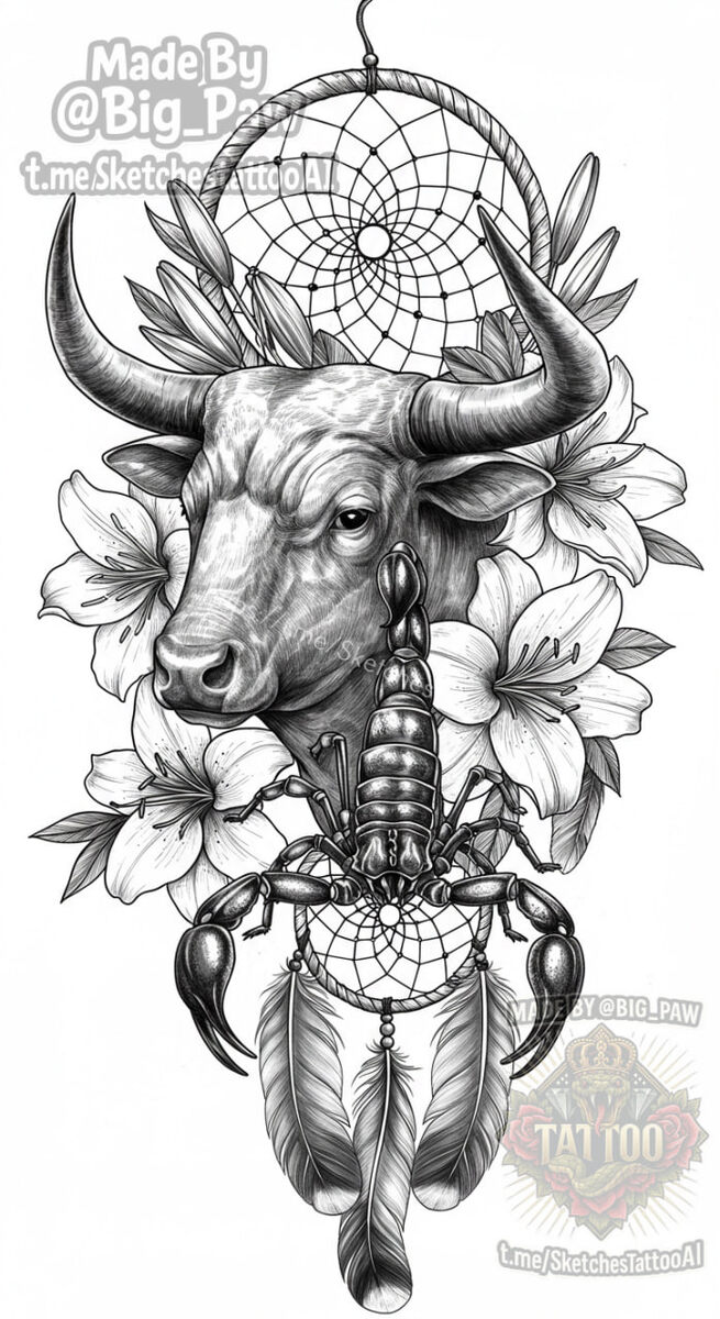 #2711 Подборка по запросу подписчика - быка со скорпионом и лилии, на фоне ловца снов, на подобии такого 🧠 SYNTX 💳 Донат 😎 НейроБро 😎 Эскизы без вотера 💀 Эскизы от нейросети #бык #скорпион #лилии #эскиз #тату #татуировка