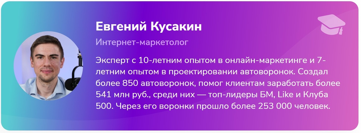 - 💎 Автор курса — Евгений Кусакин: интернет-маркетолог с 10-летним опытом, создатель 850+ автоворонок.