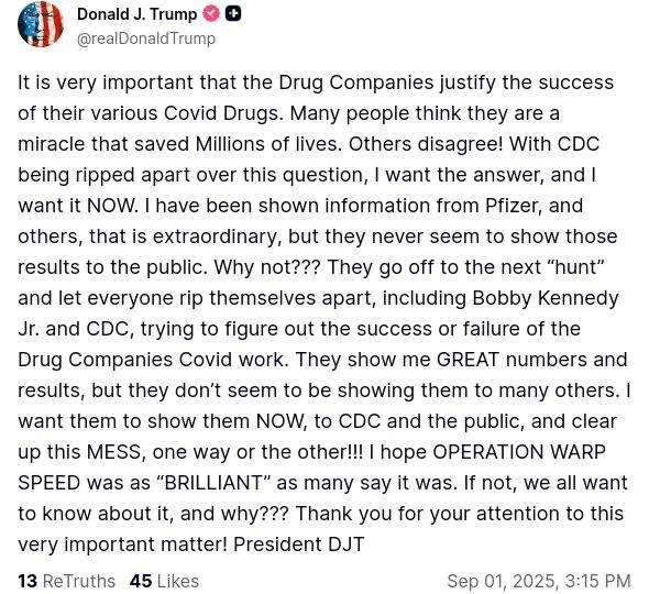 🇺🇸|❗️ ТРАМП: ФАРМАЦЕВТИЧЕСКИЕ КОМПАНИИ ДОЛЖНЫ ОБОСНОВАТЬ ЭФФЕКТИВНОСТЬ СВОИХ ЛЕКАРСТВ ОТ COVID PFIZER И ДРУГИЕ ДОЛЖНЫ ПРЕДОСТАВИТЬ ДОКАЗАТЕЛЬСТВА УСПЕХА ЛЕКАРСТВ ОТ COVID Очень важно, чтобы фармацевтические компании обосновали успех своих различных препаратов против Covid. Многие считают их чудом, спасшим миллионы жизней. Другие не согласны! Поскольку CDC разрывается из-за этого вопроса, я хочу ответ, и я хочу его СЕЙЧАС. Мне показывали информацию от Pfizer и других, которая невероятна, но они, кажется, никогда не показывают эти результаты общественности. Почему??? Они отправляются на следующую «охоту» и позволяют всем разрываться на части, включая Бобби Кеннеди-младшего и CDC, пытаясь выяснить успех или провал работы фармкомпаний по Covid. Они показывают мне ОТЛИЧНЫЕ цифры и результаты, но, кажется, не показывают их многим другим. Я хочу, чтобы они показали их СЕЙЧАС, CDC и общественности, и разобрались с этим БЕСПОРЯДКОМ, так или иначе!!! Я надеюсь, что ОПЕРАЦИЯ «Project Warp Spe
